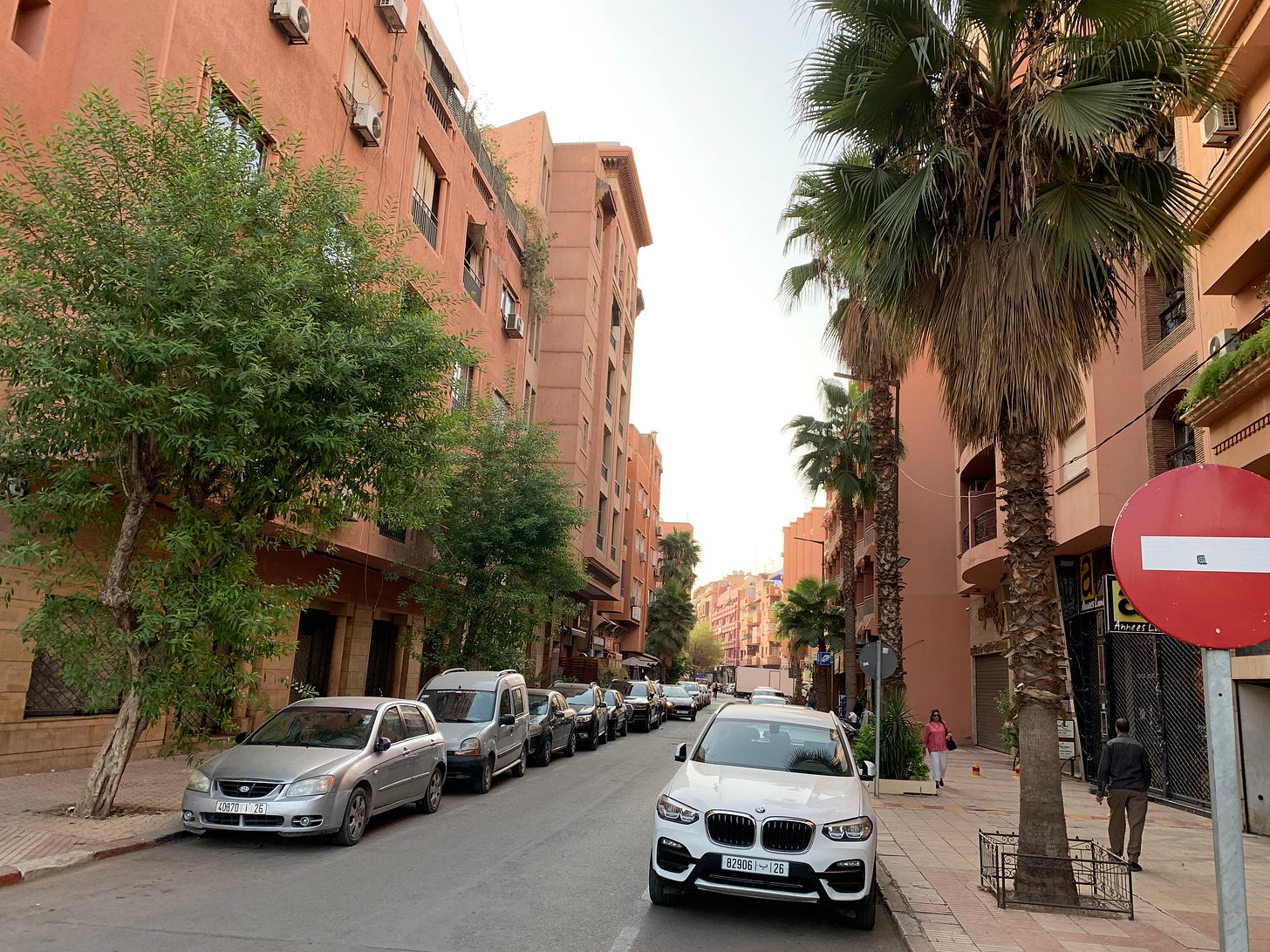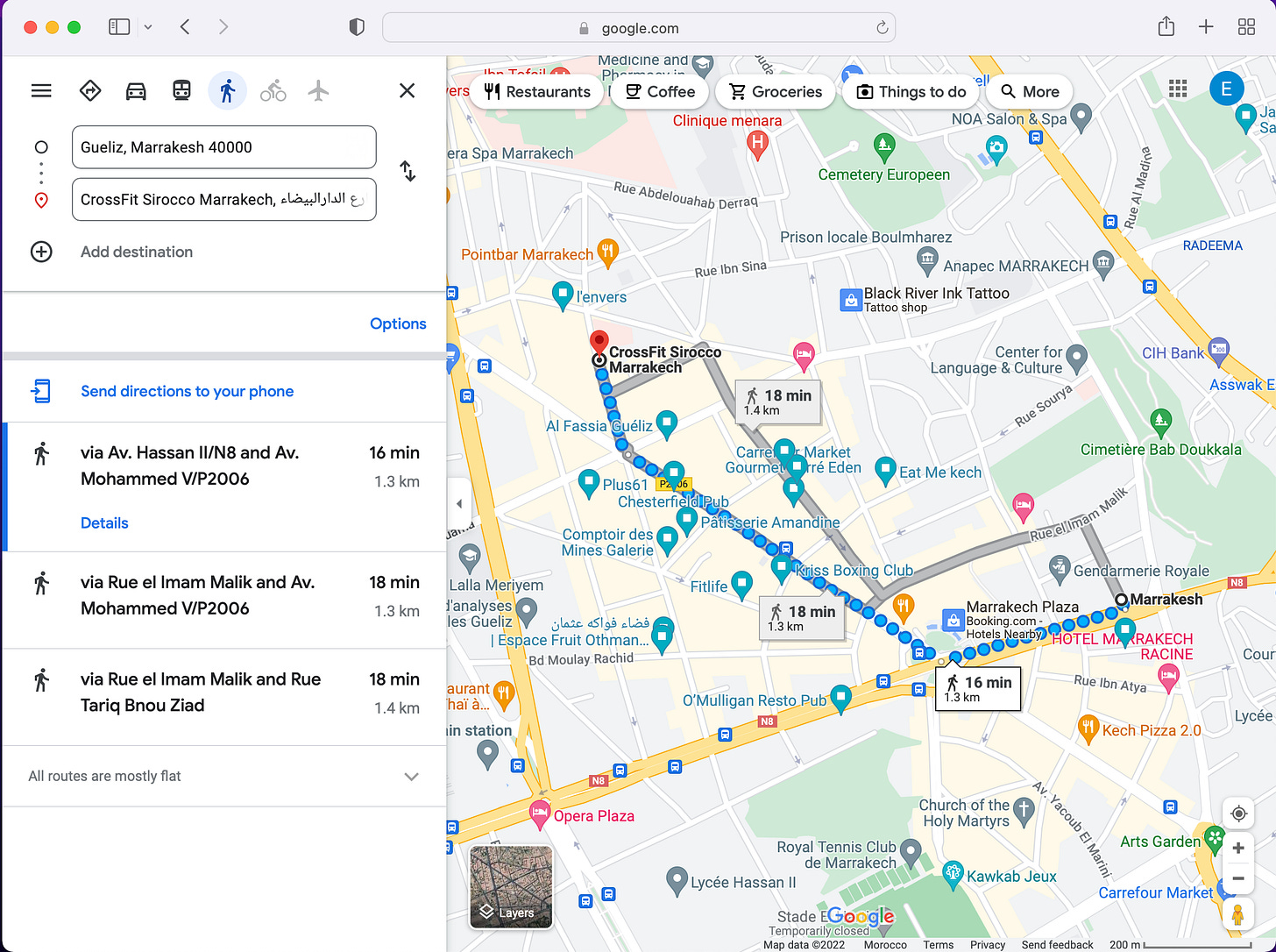 After the session and a quick shower, I normally then make my way down a few roads to the coworking space where I work. The roads in Gueliz (the most modern and French bit of Marrakech where my coworking space and gym are) look a bit like this: