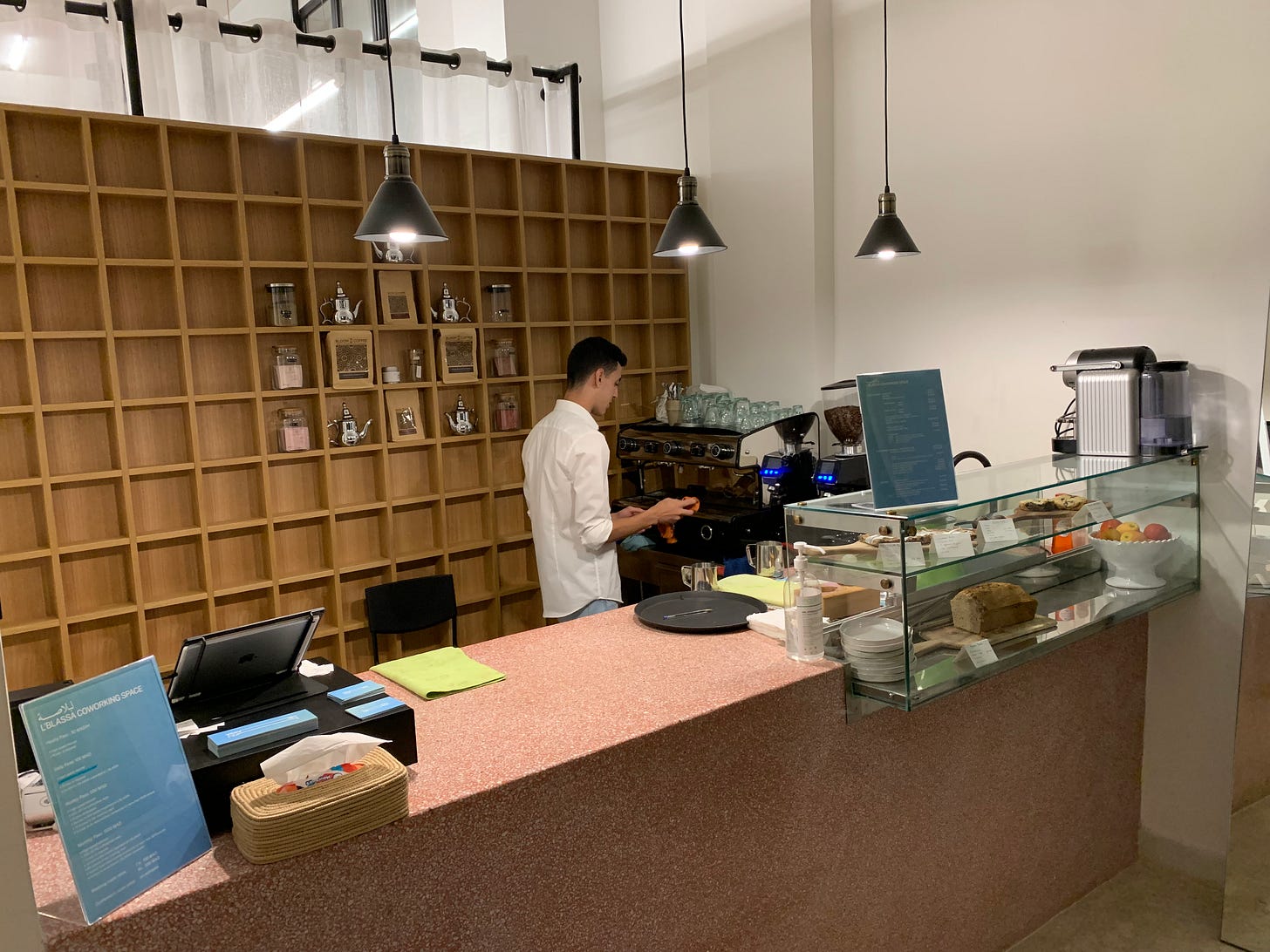 In the pic above where the Mac Pro is, there are always two lovely Moroccan women who give the best recommendations for food and anything in the area. They also have a little cafe at the front (pictured below) where the barista has taught me a bunch of Moroccan Arabic - (âAfak atteeni le mar diel robineeâ (phonetically) = âCan I please have some water from the tapâ, âAbslemaâ = âGoodbyeâ etc). Itâs just a very happy and airy place.